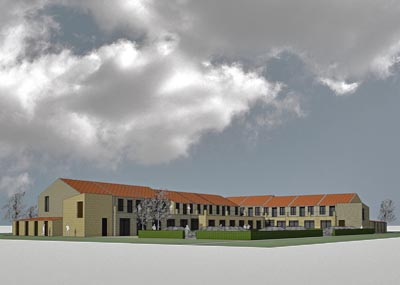 | Der Neubau vereint Pflegewohnungen im Erdgeschoss mit Starterwohnungen im Obergeschoss. Der Pflegebereich umfasst vier Wohngruppen mit jeweils 7 Bewohnern. Die tieferen Grundrisse des Erdgeschosses ermöglichen eine Gallerieerschließung der 11 Wohnungen im Obergeschoss. Städtebaulich fügt sich der Entwurf in das angestrebte kleinteilige Bild des Neubauviertels. |