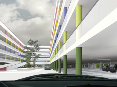 | Das Parkhaus am Westrand der Stadt Utrecht bietet nicht nur Platz für 2000 Autos, es ist auch ein infrastruktureller Knotenpunkt. Die markante Auskragung der oberen Geschosse markiert einen Raum, in dem die verschiedenen Ströme von ÖPNV, Fahrrädern und Fußgängern zusammentreffen. Die Fassadenelemente zitieren mit ihrer Materialisierung und Bearbeitung die typische Formensprache von Autos. Das Erscheinungsbild des Gebäudes variiert mit der Richtung aus der sich der Fahrer nähert. |