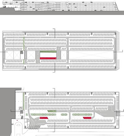 | Das Parkhaus am Westrand der Stadt Utrecht bietet nicht nur Platz für 2000 Autos, es ist auch ein infrastruktureller Knotenpunkt. Die markante Auskragung der oberen Geschosse markiert einen Raum, in dem die verschiedenen Ströme von ÖPNV, Fahrrädern und Fußgängern zusammentreffen. Die Fassadenelemente zitieren mit ihrer Materialisierung und Bearbeitung die typische Formensprache von Autos. Das Erscheinungsbild des Gebäudes variiert mit der Richtung aus der sich der Fahrer nähert. |