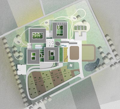 | Beitrag zum Wettbewerb "Neubau Gesamtklinikum Schaumburger Land" in Vehlen. Der Neubau ist ein Zusammenschluss unterschiedlicher Klinikstandorte. Die Stationen sind als Einzelvolumen um eine zentrale Halle gruppiert, alle Zimmer profitieren von der freistehenden Lage des Gebäudes und gewährleisten maximale Aussicht. Die Fassade greift im Entwurf den regional üblichen Fachwerkbau auf. |