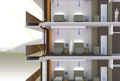| Beitrag zum Wettbewerb "Neubau Gesamtklinikum Schaumburger Land" in Vehlen. Der Neubau ist ein Zusammenschluss unterschiedlicher Klinikstandorte. Die Stationen sind als Einzelvolumen um eine zentrale Halle gruppiert, alle Zimmer profitieren von der freistehenden Lage des Gebäudes und gewährleisten maximale Aussicht. Die Fassade greift im Entwurf den regional üblichen Fachwerkbau auf. |