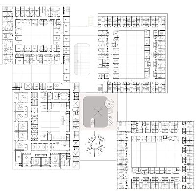 | Beitrag zum Wettbewerb "Neubau Gesamtklinikum Schaumburger Land" in Vehlen. Der Neubau ist ein Zusammenschluss unterschiedlicher Klinikstandorte. Die Stationen sind als Einzelvolumen um eine zentrale Halle gruppiert, alle Zimmer profitieren von der freistehenden Lage des Gebäudes und gewährleisten maximale Aussicht. Die Fassade greift im Entwurf den regional üblichen Fachwerkbau auf. |